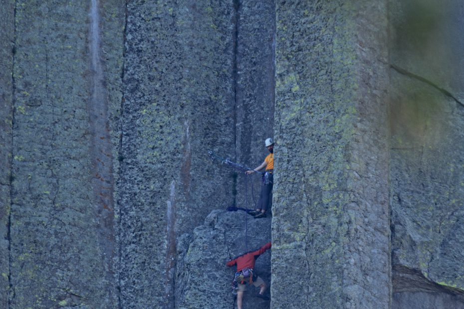 This is a close-up of the area marked on the previous photograph. Note the two climbers as they are ascending this route. Remember that each of these columns are between 20-30 feet wide. More than 6000 individuals climbed Devil’s Tower in 2016.