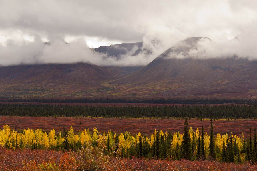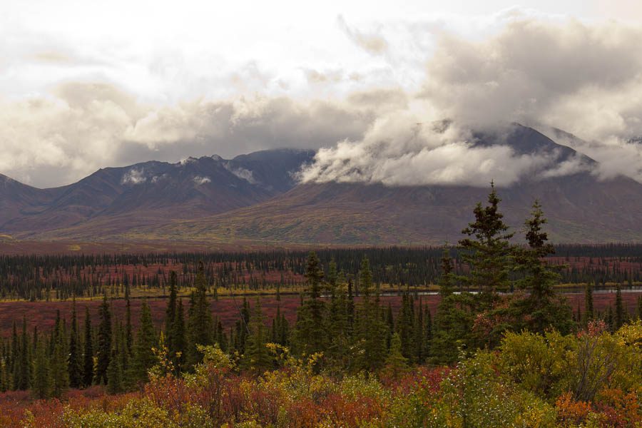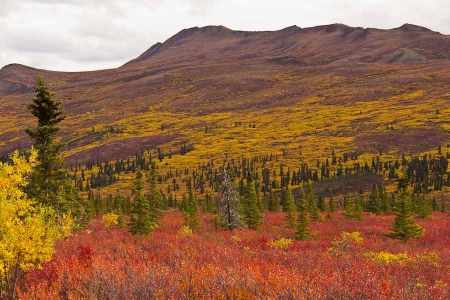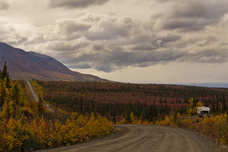 From here on, the colors of the vegetation were awesome, color combinations we had not seen before. The fall colors we experienced elsewhere in the lower 48 and British Columbia revolve around the trees. Here, the colors result from the ground vegetation! Undergrowth vegetation for our first month or so in Alaska has been nondescript. Now, it is the undergrowth which grabs and holds our attention. Before even coming to Alaska we had looked forward to seeing Alaska in the fall. We are fortunate to see the fall colors for several reasons. Perhaps the most interesting is it’s short life! Colors here seem to last no more than two weeks! By the time we leave Fairbanks we suspect all the color will be gone!