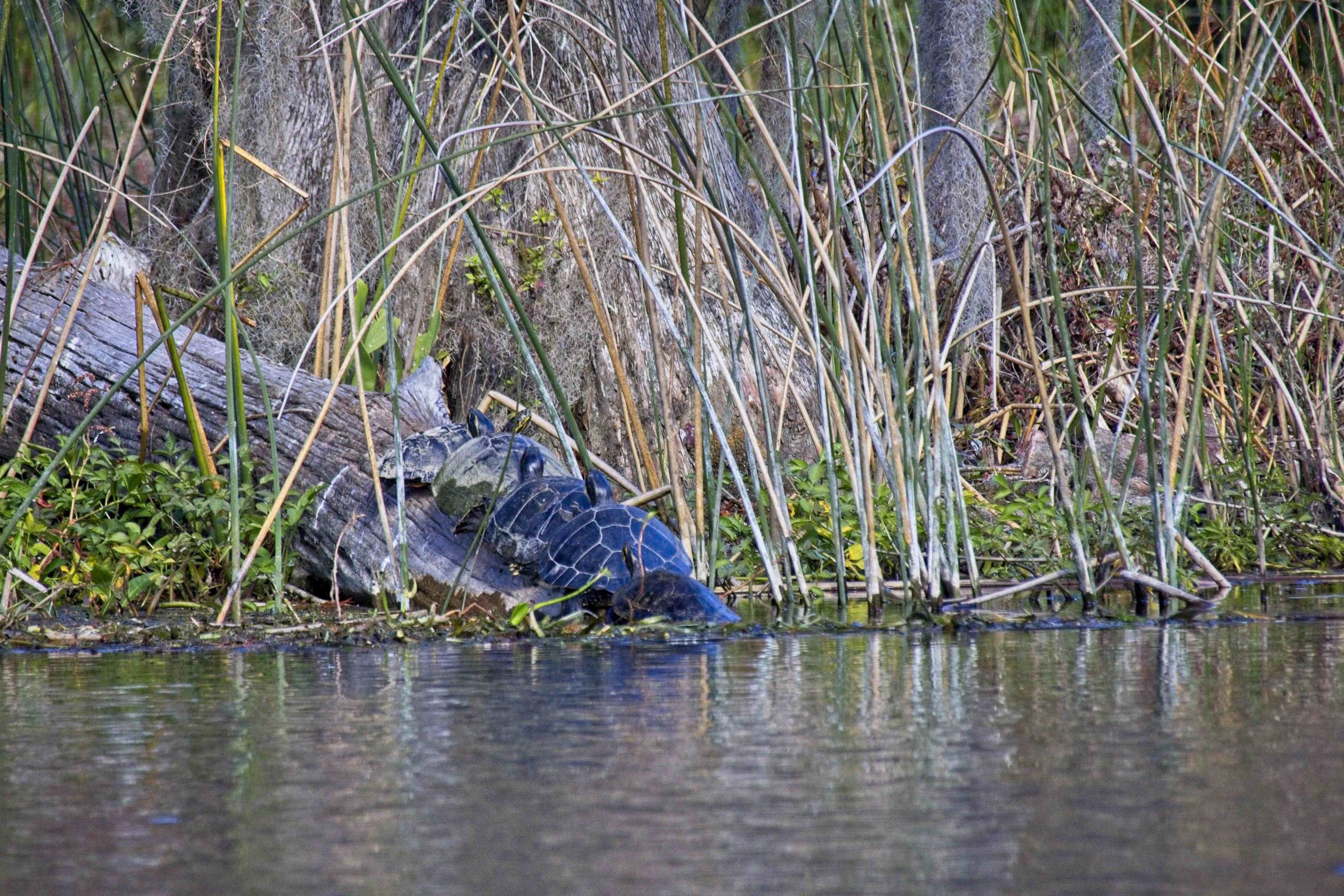 Dozens and dozens of turtles mostly resting on logs like these fellows.