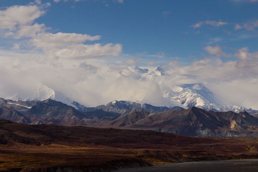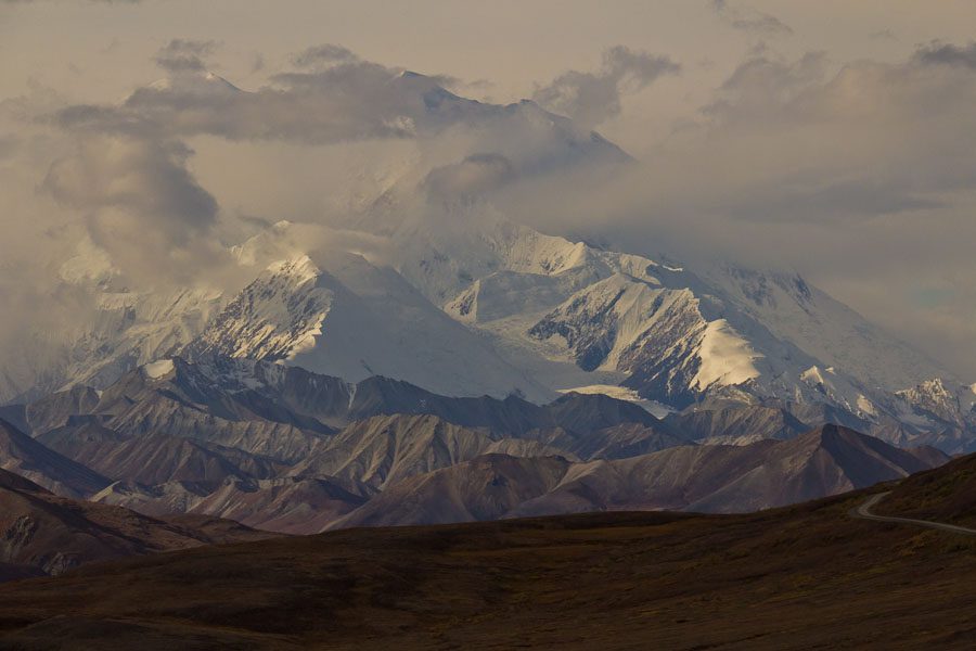 The road we traveled on was originally created in the mid-1920s as a way for the visitor to get a closer view of Mt. McKinley. It has been improved since then but basically serves the original purpose. Throughout the accompanying photographs, we attempted to give you differing views of the changing face of McKinley. Combine these photographs with previous ones we have posted and you can get a good feel for the highest peak in North America. When taking these photographs, the closest approach we make to McKinley was 33 miles from its base.