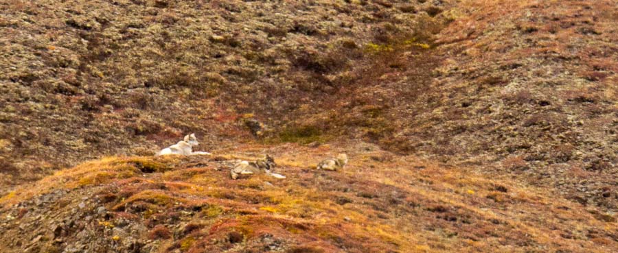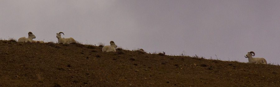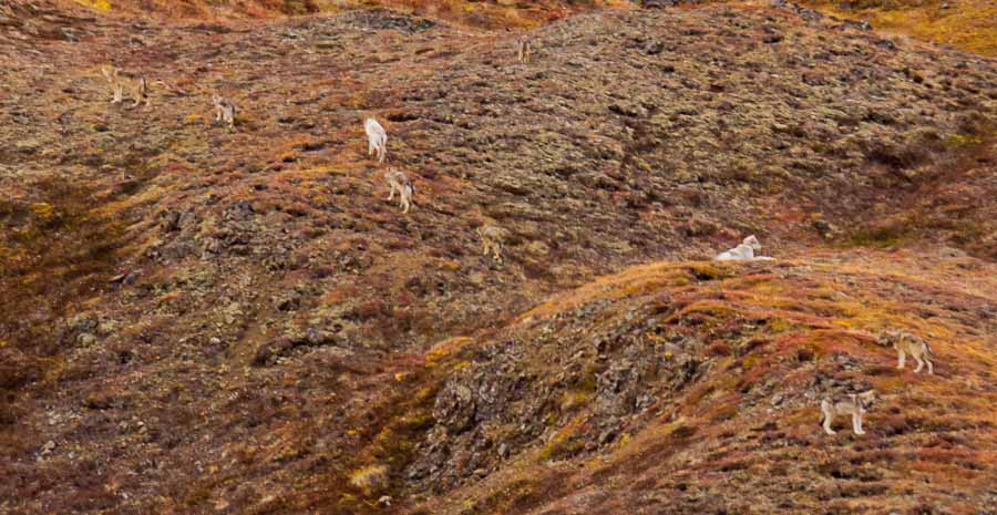Our first view of wildlife was a lone coyote on a hill, silhouetted on the skyline. We then came across Dall sheep, great vistas and grizzly bear. At one point we stopped for a particular landscape view and Meriam said “I think I hear wolves howling!” I responded “No, that’s just the wind.” Well, guess who was wrong! Off to our right, on the side of a hill, was a pack of wolves! We counted a total of 12. The bus driver said this was his first sighting, having driven the bus every day for the entire summer. What luck and what an experience! We must have watched them for at least 15 minutes as they milled around together. Time forced us to continue on. Oh hum… More bears, more vistas, more great views of Mt. McKinley until we reached our turnaround point at Eielson Visitor Center about 66 miles into the park. After a 30 minute stop, we began our return.