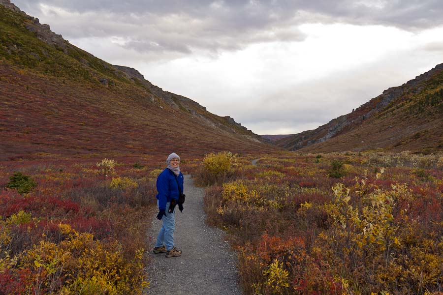 As I mentioned, we could get off the bus at any point along the road. Meriam and I had planned to do this. However, two things discouraged this desire. First, it was really cold and windy. Although it was partly cloudy, we suspect the wind chill factor was probably 30-35 degrees. We were not dressed for this cold of temperature. Second, it had not rained recently and walking the road would expose us to clouds of dust stirred up by the passage of numerous buses as they came and went. So, we remained on the bus till we arrived at our campground. But all was not lost. On the return trip we saw more bear, more Dall sheep and more vistas. Needless to say we were not bored!